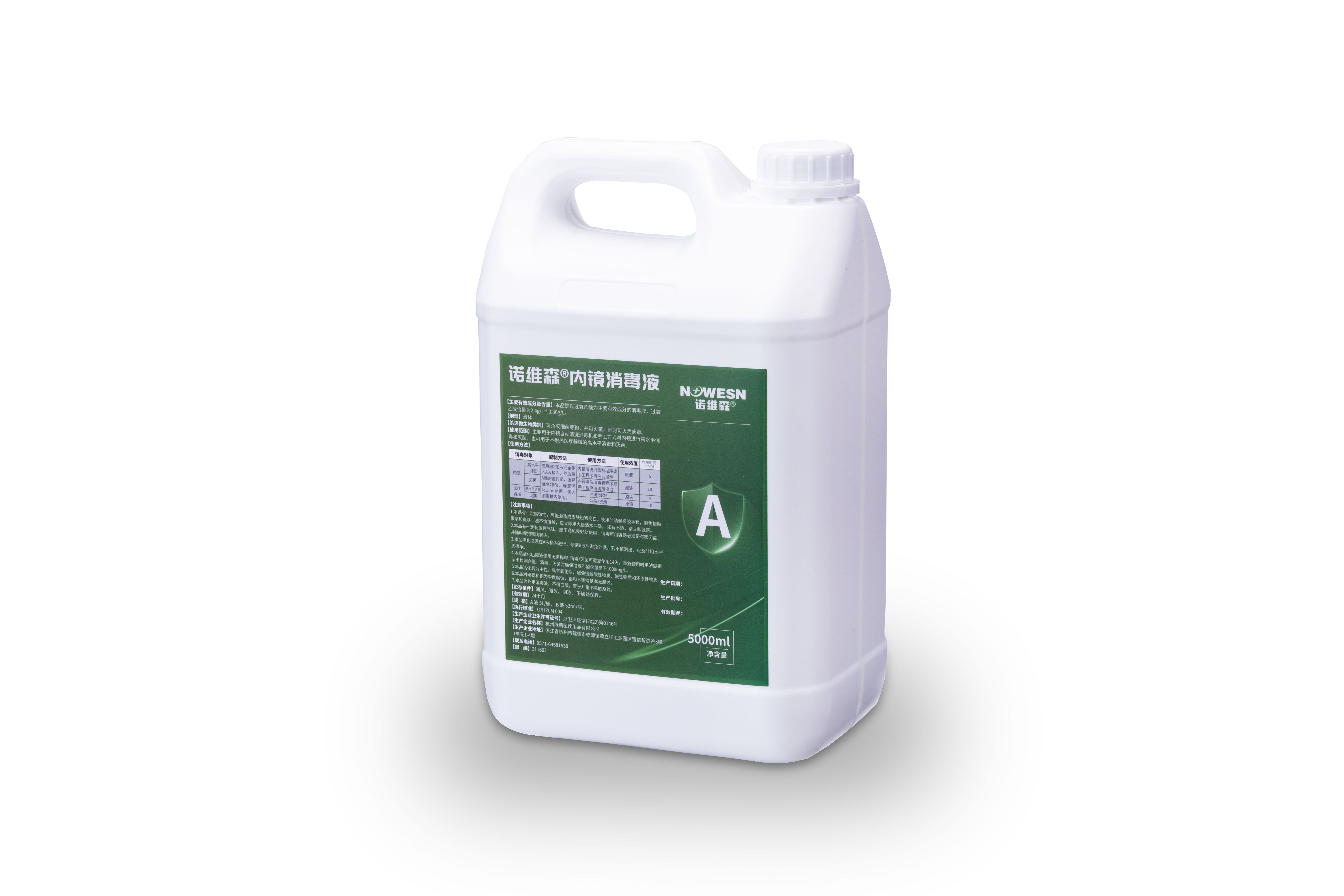 内镜 | 高水平 消毒 | 使用前将B液完全倒入A液桶内,然 后将A桶的盖拧紧,摇晃 混合均匀,静置活化10min后,倒入消毒槽内使用。 | 内镜清洗消毒机程序或手工程序清洗 后浸泡 | 原液 | 5 |